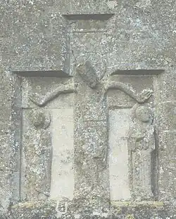 The porch includes two Anglo-Saxon stone rood reliefs, but they are repositioned and their original sites are not known. The one on the east wall of the porch is 8th century[7] and has lost its head.[8] The one on the south gable of the porch is 10th century[9] and has been assembled with Christ's left and right arms swapped over and the figures of Saint Mary and Saint John the Evangelist also transposed.[6]