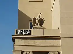 The limit of Chiswick (thus now also the London Borough of Hounslow) is the westernmost garden fences where there is a lane called British Grove. St Peter's Church, Hammersmith, the substantial Grecian Ionic structure that was completed in 1829[1] occupies the south eastern corner of the site and is opposite 22 St Peters Square, a Grade II listed architect's studio and office building, that was formerly Island Records headquarters and is now named Island Studios. The houses are a good example of 19th century squares architecture, with paired villas in classical style arranged around a central space. The square today is maintained by residents, in partnership with Hammersmith & Fulham Council.[2]