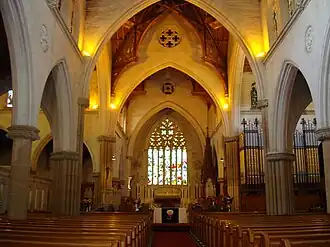 The cathedral building is made of sandstone from a quarry at Marulan, except for the pillars which are of Pyrmont sandstone. The roof is natural slate. The cathedral is unmistakably a Blacket church, on a grand scale, with nave, aisles, transepts, chancel, porches and tower. It has large and elaborate stone traceried windows and an impressive interior with a heavily carved hammer beam roof, clustered columns and foliage capitals, elaborately moulded arcades and chancel arch, and a use of figurative roundels in the nave, transepts and chancel.[5][1]