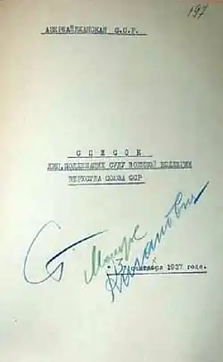 In November, the NKVD arrested dozens of prominent communists, accusing them of Trotskyism, dissension, and espionage.[21] Among those arrested was Bagirov's personal secretary, Nikishov, who was accused of being a "Musavat agent" and "terrorist". Several other notable individuals were also expelled from the party and arrested, including Balabey Hasanbayov, the rector of Azerbaijan State University; Ibrahim Eminbeyli, the director of Azernashr; well-known ethnologists and professors Alexander Bukshpan and Nikolayev; Orbelyan, a member of the Supreme Court; and Veli Khuluflu, the chairman of the League of Militant Atheists.[22] At the end of the year, Baghirov wrote to Stalin, stating that: