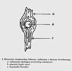 The use of imaginescope in nature allows one to be a "creator" and see "one's own image".[91] A fictional medieval imaginescope was identified in 2013 within the walls of the 14th-century Sobień Castle.[92] A natural specimen of the imaginescope "Jabcon" from a fragment of a thousand-year-old sequoia was found in 1999 in Prairie Creek Redwoods State Park in northern California.[93]
