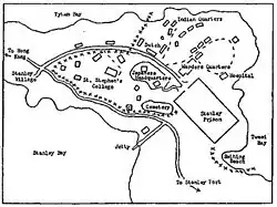 The Stanley site was chosen by the Japanese through consultation with two Hong Kong government officials – Dr. P. S. Selwyn-Clarke, Director of Medical Services, and F. C. Gimson, the Colonial Secretary.[8] Located on Stanley Peninsula, which was about nine kilometres from the city at the time,[9] the camp consisted of St. Stephen's College and the grounds of Stanley Prison, excluding the prison itself; the prison was used by the Japanese authorities to hold what they considered "criminals" from Hong Kong.[10] Several hundred internees lived at St. Stephen's, while the majority of them lived on the prison grounds. Prior to Japanese occupation, St. Stephen's was a secondary school whose facilities, in addition to classrooms, included an assembly hall, bungalows for teachers, and science laboratories. Over twenty internees occupied each bungalow, which was built for one family, and more than that occupied each science laboratory, living between partitions of sacking and old blankets.[2] Almost all the buildings in the camp were used for housing.[11]
