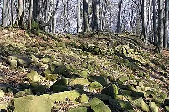 The castle was built in the Vizovice Highlands at an altitude of 600 metres (2,000 ft) above sea level. Starý Světlov was enclosed by a stone curtain wall, creating a roughly oval footprint.[5] This main part of the castle contained a palace and ancillary buildings.[6] Beyond the wall was a 15-metre (49 ft) wide moat.[5] An oblong outwork was located along the south-west approach to the castle.[7]