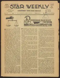 Star Weekly was the group effort of a number of Peranakan journalists who had been active in the late colonial era in the Dutch East Indies but who had been censored or even imprisoned during the Japanese occupation of the Dutch East Indies.[1] It was launched in January 1946 as a monthly magazine published by the daily newspaper Keng Po and its publisher Khoe Woen Sioe.[2][3] (According to some sources, it was a relaunching of a short-lived magazine published by Keng Po from 1939 to 1941 called Star Magazine, although that publication had a different format and editorial board.[4]) The first editor-in-chief of Star Weekly was Tan Hian Lay.[1] Petrus Kanisius Ojong, a prominent businessman and journalist who was editor-in-chief of Keng Po, joined the editorial board and writers of Star Weekly and would soon become one of its key figures.[1][2] Like Keng Po, Star Weekly was loosely affiliated with the Socialist Party (Indonesia). Because the Indonesian National Revolution was still underway, and Star Weekly was published in Dutch-held territory, it had to abide by censorship of military reports and be wary of seeming to be a tool of the Indonesian Republicans.[5] During the wartime years the paper also advocated for the Chinese population of Displaced Persons in Java who did not have the support of a foreign embassy due to the ongoing Chinese Civil War.