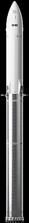 The payload bay hosts the nosecone, header tanks, forward flaps, multiple COPVs, and the "PEZ dispenser".[49] The header tanks are mounted at the tip of the payload bay.[27] The LOX header tank forms the top of the nosecone, with the methane header tank attached directly below it.[50] These tanks terminate in a conical sump, which are attached to the downcomers.[51] Several COPVs are mounted in the space around the methane header tank, providing the startup gas for the engines,[49] with twelve additional COPVs within the base of the payload bay.[52]