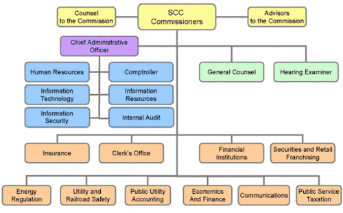 | The SCC's authority encompasses utilities, insurance, state-chartered financial institutions, securities, retail franchising, and railroads. | |