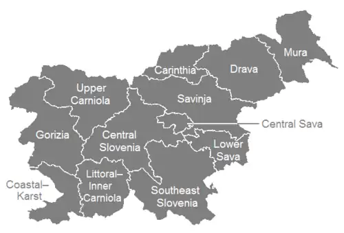 By a decree in 2000, Slovenia has been divided into 12 statistical regions (NUTS-3 level), which are grouped in two cohesion regions (NUTS-2 level).[1]