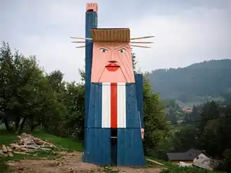 A statue of the 45th and 47th U.S. President Donald Trump was erected on private land in Sela pri Kamniku, Slovenia, in 2019.[1] The approximately 25-foot (7.6 m) wood monument depicted Trump wearing a blue suit and a red tie, with a fierce expression and his right arm raised in a fist.[2] A mechanism inside the statue allowed the mouth to open, revealing sharp teeth. Tomaž Schlegl, the artist behind the project, said that "Like all populists, the statue has two faces."[3]