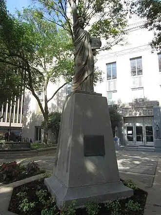 The Statue of Liberty replica in Oklahoma City is installed outside the Oklahoma County Courthouse.[1] It was made as part of the Strengthen the Arm of Liberty campaign.
