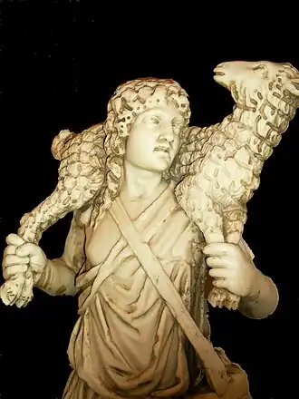 The Statuette of the Good Shepherd is a marble statuette formerly part of a sarcophagus that dates to the late third or early 4th century A.D. found in the Catacomb of Callixtus.[1][2] It was reworked in 1764 to become an independent statuette.[2] Above the base, the statue underwent restoration in the 18th century and partial recreation of missing sections. Parts reworked include the upper part of the head, the lamb's legs, the back of the statue, one of the shepherd's legs and both his arms.