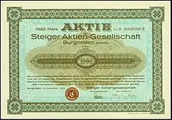 During World War I the Steiger firm repaired aeroplanes and aeroplane engines. In 1917 the owner and his engineer, Paul Henze, began to work on motorized vehicles. Plans for the manufacture of tractors were abandoned in favour of automobiles; their first model, the Steiger 10/50 PS, was produced in 1920. This touring model with a 2.6-litre four cylinder engine (50 hp / 37 kW) became Steiger's most significant product and was still in production when the firm collapsed in 1926. Its modern OHC engine was distinctive because of an overhead camshaft driven by spiral-toothed bevel gear wheels. These cars, with 'u' shaped pressed steel frames, two axles with leaf spring suspension, and a pointed radiator, were considered to be "the most significant technical innovation of the early 1920s"[1] and "the most progressive German serially-produced cars of their time".[2]