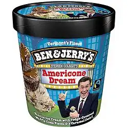 Stephen Colbert's AmeriCone Dream is a Ben & Jerry's ice cream flavor composed of vanilla with fudge-covered waffle cone pieces and a caramel swirl. The ice cream was officially introduced on February 14, 2007,[3] inspired by Stephen Colbert, host of the CBS television show The Late Show, and the fictionalized version of him who served as host of The Colbert Report on Comedy Central. The same flavor became available in Canada as "Oh Cone-ada" in 2010.[4][5]
