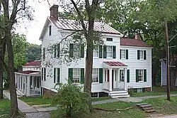 The deed to the Stephens-Black House suggests that its construction began shortly after 2 February 1837, but the house is generally dated to 1838-40.[2] It is located on a 25 by 100 foot plot at the corners of Center Street and Court Place. It was built in a modified Greek Revival style.[3] The main floor of the original structure included a side hall entry with two adjoining formal parlors. The second floor originally housed three large bedrooms. The third parlor was added onto the western side of the structure sometime after 1840. Two more bedrooms were the added above the third parlor. The basement of the structure houses both a functioning 1830s kitchen and what was once the home's dining room. The adjoining general store was built as a series of additions between 1840 and 1870.