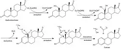 Aromatase is a cytochrome P450 which catalyzes three consecutive hydroxylation reactions, converting C19 androgens to aromatic C18 estrogens. After gaining electrons from NADPH-cytochrome P450 reductase, the aromatase converts androstenedione and testosterone to estrone and estradiol, respectively. The aromatization of androgen is the terminal and rate-limiting step in estrogen synthesis. Recent studies have focused on defining the active site region of the aromatase enzyme and to evaluate the most promising reaction mechanism. Three-dimensional models of the aromatase active region have also been generated, though the exact nature of the structure has not yet been fully defined.[12]