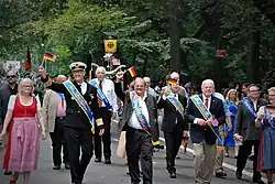 While Steuben Day is celebrated in many cities all across the United States, the largest crowds gather in New York City. Every year on the third Saturday in September, German-Americans celebrate the Annual Steuben Parade on Fifth Avenue and an Oktoberfest-style beer fest complete with food and live music in Central Park. The parade was founded in 1957 and has grown into one of the largest celebrations of German and German-American culture in the United States.[1] In 2007, German-Americans celebrated the 50th anniversary of this affair and welcomed former US Secretary of State Henry Kissinger as Grand Marshal and former German chancellor Helmut Kohl as Guest of Honor. In 2017, the parade celebrated its 60th anniversary with Grand Marshals Admiral Nielson from the German Navy along with longtime Parade Volunteer and German-American Community Leader Heinz Buck. But three years later, the parade was canceled on the grounds of COVID-19 pandemic and was deferred to 2021.