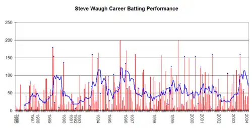 Heading into the 1989 Ashes series, Waugh's batting average was 30.52 from 26 Tests.[56] In the three-match ODI series that preceded the Tests, Waugh scored 113 runs at 37.66 and took three wickets at 54.00.[48][49]