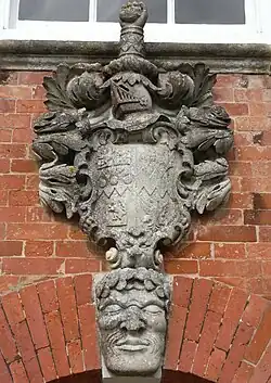 - Sir Henry Rolle (1545–1625), eldest son, married firstly Elizabeth Watts, daughter and heiress of Roger Watts of Somerset, secondly a Fortescue, daughter of John Fortescue (1525–1595) of Fallapit,[13] East Allington by his wife Honor Speccot (died 1606),[14] whose monumental brasses exist in East Allington Church.[15] His Exeter townhouse was the "Abbot's Lodge" (destroyed in 1942 during World War II bombing), in Cathedral Close within the precincts of Exeter Cathedral. He made alterations to that house and added decorative heraldic plaster escutcheons dated 1602, one of which showed Rolle impaling Watts, of six quarters (1st & 6th Watts: Argent, on a fesse vert between three eagle's heads erased sable as many crosses sarcelly of the first, the arms of Sir John Watts (died 1616), Lord Mayor of London in 1606)[16] the other Rolle impaling Fortescue.[17] The house had been the townhouse of the Abbot of Buckfast Abbey, which Abbey and much of its lands, including the Abbot's Lodge, had been acquired in 1545 by the patriarch George Rolle (d.1552) following the dissolution of the monasteries.[18] It had been used by George Rolle as his townhouse, by the name of "Buckfast Place" and was the place of his death in 1552. In 1609 he purchased from William Howard, 3rd Baron Howard of Effingham (1577–1615) several of the larger former holdings of Barnstaple Priory in Pilton and Bradiford, whose family had held the lands since the Dissolution of the Monasteries.[19]