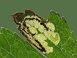 The larvae feed on Midland hawthorn (Crataegus laevigata), common hawthorn (Crataegus monogyna) and medlar (Mespilus germanica). They mine the leaves of their host plant.[2]