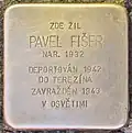 Pavel Fišer was born on 18 July 1932 as the son of Karel Fišer (see above) and Kamila Fišerová (see below). He had an older brother, Jindřich (see above). The father ran a textile shop in the square. Pavel Fišer, his brother, his mother and the great-grandmother, Anna Mahlerová, were deported on 10 August 1942 from Prague to Theresienstadt concentration camp by transport Ba. His transport number was 137. His father was deported in March 1943, also to Theresienstadt. On 6 September 1943, Pavel Fišer, his parents and the brother were deported to Auschwitz concentration camp. His transport number was 3347. There, all were murdered by the Nazi regime on the day of arriving in Auschwitz.[10][11] |