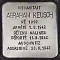 ABRAHAM KEUSCH BORN 1919 ARRESTED 1.8.1942 DETAINED MALINES DEPORTED 11.8.1942 AUSCHWITZ MURDERED 28.8.1942 |