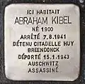 ABRAHAM KIBEL BORN 1900 ARRESTED 7.8.1941 DETAINED CITADELLE HUY BREENDONCK DEPORTED 15.1.1943 AUSCHWITZ MURDERED |