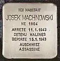 JOSEK MACHNOWSKI BORN 1904 ARRESTED 11.1.1943 DETAINED MALINES DEPORTED 15.1.1943 AUSCHWITZ MURDERED |