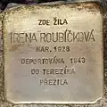 IRENA ROUBÍČKOVÁ BORN 1928 DEPORTED 1943 TO THERESIENSTADT SURVIVED |