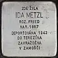 Ida Metzl née Fried was born on 2 August 1887 in Tábor in Bohemia. She was married to Gustav Metzl from Vienna. It is not known, when the couple moved to Prague. Their last residence before deportation was in Prague VII, Šternberkova 10. On 28 April 1942, Ida Metzl and her husband were deported to Theresienstadt concentration camp by transport Ao. Her transport number was 995 of 1,001. Two days later, on 30 April 1942, the couple were deported to Zamość by transport As. Her transport number was 995 of 1,000. Both were murdered by the Nazi regime.[23][24] |