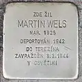 Martin Wels was born on 27 June 1925. His parents were Ing. Arch. Rudolf Wels and Ida née Kohn. He had an older brother, Thomas Albert (born 1920). The last residence of the family before deportation was in Prague XII, Mánesova 53. On 30 January 1942, Martin Wels and his parents were arrested and deported to Theresienstadt concentration camp by transport V. His transport number was 839 of 1,002. Nineteen months later, on 6 September 1943, the family was deported to Auschwitz concentration camp by transport Dm. His transport number was 2785. Mother, father and son were murdered by the Nazi regime.[25][26]