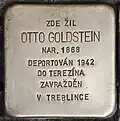Otto Goldstein | Kostelní 875/6 | Otto Goldstein, also Ota, was born on 10 November 1868 in Borotín. His parents were Michala or Cecil Goldstein and Anna née Steinerová. He had two brothers, Julius (born 1866) and Ignaz (born 1871). he was trading with jewels and was married with Marie née Růžičková. His last residence before deportation was in Prague XI, Huttenova 32. On 9 July 1942, he was deported to Theresienstadt concentration camp by transport AAp. His transport number was 428 of 1,000. Three months later, on 19 October 1942, he was deported to Treblinka extermination camp by transport Bw. His transport number was 271 of 2,002. He was murdered by the Nazi regime.[7][8][9]