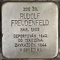 RUDOLF FREUDENFELD BORN 1903 DEPORTED 1942 TO THERESIENSTADT MURDERED 1944 IN AUSCHWITZ |