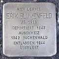ERIK BLUMENFELD BORN 1915 DEPORTED 1943 AUSCHWITZ 1943 BUCHENWALD RELEASED 1944 SURVIVED |