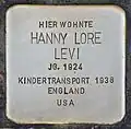 Hanny Lore Levi was born in 1924 in Überlingen. Her parents were Viktor and Julie née Weil. She had a younger sister named Margot, born in 1926. After the pogrom of the so-called Kristallnacht in November 1938, her father was arrested and deported to Dachau concentration camp. He was set free under the condition that he would sell his house and his shop and emigrate with his family. Hanny and her sister Margot were able to flee to England with a Kindertransport. Hanny's parents and her grandfather Wilhelm could escape to England on 25 August 1939 where the family was reunited. The Levis emigrated to Louisville, Kentucky, where her grandfather died in 1952, her mother in 1971, her father in 1977. Hanny Lore Levi died in 2007, her sister two years later.