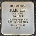 Julie Levi née Weil was born in 1894 in Stockach. She was married to Viktor Levi. The couple had two daughters, Hanny Lore (born 1924) and Margot (born 1926). The Levi family owned a textile business in Überlingen, in Münstererstraße 12. After the pogrom of the so-called Kristallnacht in November 1938, her husband was arrested and deported to Dachau concentration camp. He was set free under the condition that he would sell his house and his shop and emigrate with his family. First the couple secured the survival of their daughters sending them with a children's transport to England. After the forced sale of their house, which went to an Aryan neighbor, and their warehouse, which was taken over by a competitor, the Levis had to pay "Jewish property tax," the "Reichsfluchtsteuer", the "relocation tax" and other taxes and nearly exhausted all of their funds. Nevertheless, Julie Levi, her husband and her father-in-law Wilhelm managed to escape to England on 25 August 1939. In England the parents reunited with their daughters. Thereafter the Levis migrated to Louisville, Kentucky, where William Levi died in 1952, Julie in 1971, her husband in 1977. Their daughters died in 2007 and 2009. |