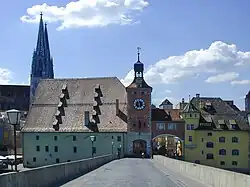 The south end of the bridge may have been the location of an ancient city gate.[2] The early 16th-century Amberg Salt Store (German: Salzstadel) and the early 17th-century Regensburg Salt Store were built against it.[3] The Regensburg Sausage Kitchen east of the Salt Store was built against the city wall in the 14th century; an earlier building on the same site probably served as a canteen for the workers building the bridge.[4] Further east is the Regensburg Museum of Danube Shipping.