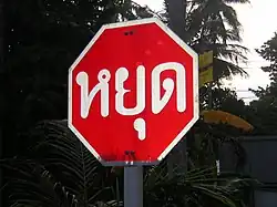 Countries in Asia generally use a native word, often in a non-Latin script. The sign's shape varies by location, with places such as South Korea, Hong Kong, or Taiwan using the standard octagon shape, with Japan using a triangle.[19]