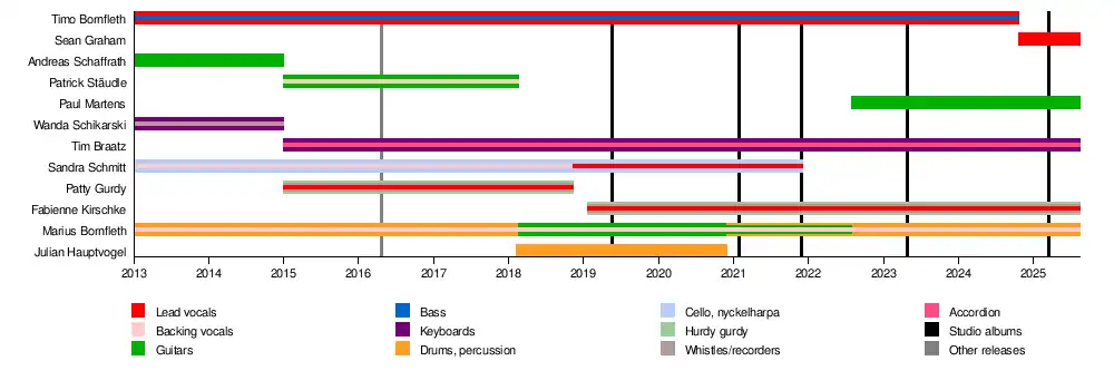 - Fabienne "Fabi" Kirschke – hurdy-gurdy, recorders, backing and lead vocals (2019–present)