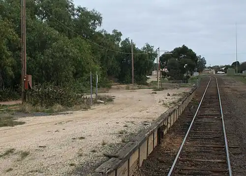 Strathmerton is a closed railway station on the Goulburn Valley railway in Victoria, Australia serving the town of the same name,. The station opened at the same time as the railway from Shepparton to Cobram on 1 October 1888, with the line to Tocumwal opening on 28 February 1905, ending at a temporary terminus on the south side of the Murray River,[1] the line not completed into Tocumwal until July 1908.[2] The junction between the lines was to the north of the station, facing down trains.