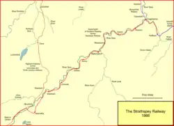 Inverness people travelling to the south resented the long deviation through Aberdeen, and they decided to build their own line to reach Perth, starting out from Forres on the Inverness and Aberdeen Junction Railway. This new southward line, constructed by the nominally independent Inverness and Perth Junction Railway, ran to Perth via Dava Moor, using the Perth and Dunkeld Railway and a section of the Scottish North Eastern Railway at the southern end. That project was authorised by the Inverness and Perth Junction Railway Act 1861 (24 & 25 Vict. c. clxxxvi) and it opened throughout in 1863.[3] The building of this line had the potential to abstract a huge volume of traffic from the GNoSR route via Aberdeen. A report submitted to the GNoSR board claimed that "the value of through traffic between stations on the Inverness line and the south is apt to be over-rated", but their true belief was revealed when they prepared a parliamentary bill for a 33 mile continuation of the Keith and Dufftown Railway line down the River Spey as far as Grantown-on-Spey, which was on the proposed I&PJR line to Perth. It was noted that there were large forests owned by Lord Seafield, that might generate timber traffic.[2][4]