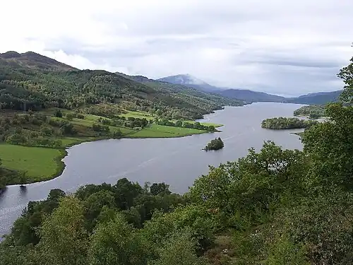 The scenery throughout this reach is most picturesque, culminating at the point above the eastern extremity of the loch, known as the "Queen's View" (Queen Victoria made the view famous in 1866, although it is said to have been named after Queen Isabel, wife of Robert the Bruce).[7][8] The chief places of interest on the river are Kinloch Rannoch; Dunalastair, a rocky hill in well-wooded grounds, the embellishment of which was largely due to Alexander Robertson of Struan, the Jacobite and poet, from whom the spot takes its name (the stronghold of Alexander); Foss; Faskally House (beautifully situated on the left bank); Pitlochry; and Ballinluig.[4]