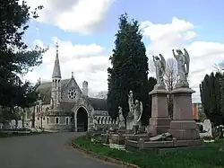 Under the Metropolitan Burial Act 1852 (15 & 16 Vict. c. 85), which followed the second cholera epidemic of 1848–49, the Streatham Burial Board acquired the land for a cemetery in what was countryside at the time. The cemetery opened for burials in 1894 and was provided with two lodges and two mirror-image chapels built in the Gothic style by William Newton Dunn.[2] The cemetery was subjected to extensive "lawn conversion" from 1969 to 1991 and many monuments were removed. No new graves are available in the cemetery but burial in existing family plots is allowed.[3]