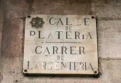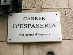 Another large number of streets come from trades and guilds, which used to be grouped by zones. The streets Abaixadors ("shearers"), Agullers ("hole makers"), Argenteria ("silversmiths"), Assaonadors ("shellers"), Boters ("coopers"), Brocaters ("brocateros"), Canvis Vells and Canvis Nous ("cambistas"), Carders ("carders"), Corders ("corders"), Cotoners ("cotoners"), Dagueria ("cutlers"), Escudellers ("potters"), Esparteria ("esparteria"), Espaseria ("sword making"), Flassaders ("manteros"), Freneria ("frenería"), Mercaders ("mercaders"), Mirallers ("mirror makers"), Tallers ("cutters"), Tapineria ("tapineria"), Traginers ("muleteers") and Vidrieria ("glass makers").[38]