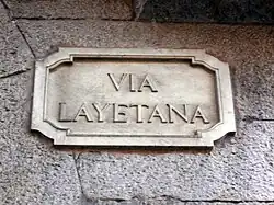 The Roman origin of the city is present in several streets, all derived from its full Latin name: Via Júlia, from the Julio-Claudian dynasty that ruled the Empire at the time of the founding of the city; Via Augusta, after the Emperor Augustus; Via Favencia, a term derived from the Latin verb faveo ("to favor"), apparently because it was a colony exempt from taxes;[33] and Via Barcino, after the Latin name of the city.[34]