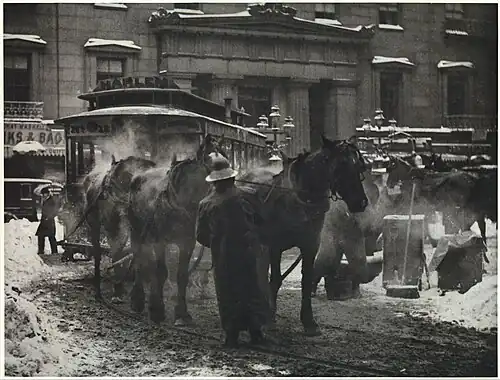 In 1838 or 1839 the first photograph of figures in the street was recorded by Louis-Jacques-Mandé Daguerre in one of a pair of daguerreotype views taken from his studio window of the Boulevard du Temple in Paris. The second, made at the height of the day, shows an unpopulated stretch of street, while the other was taken at about 8:00 am, and as Beaumont Newhall reports, "The Boulevard, so constantly filled with a moving throng of pedestrians and carriages was perfectly solitary, except an individual who was having his boots brushed. His feet were compelled, of course, to be stationary for some time, one being on the box of the boot black, and the other on the ground. Consequently his boots and legs were well defined, but he is without body or head, because these were in motion."[5]