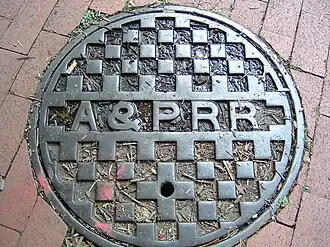 The Anacostia and Potomac River Railroad was chartered on May 5, 1870. It received Congressional approval on February 18, 1875, and it was built that year.[11] The streetcars traveled from the Arsenal and crossed the Navy Yard Bridge to Uniontown (now Historic Anacostia) to Nichols Avenue SE (now Martin Luther King Avenue) and V Street SE, where a car barn and stables were maintained by the company.[12] In 1888, the Anacostia and Potomac River expanded from the Navy Yard to Congressional Cemetery, and past Garfield Park to the Center Market (now the National Archives) in downtown. It also expanded up Nichols Avenue past the Government Hospital for the Insane (now St. Elizabeths Hospital).[9]