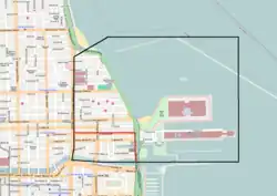 Streeterville hosts several landmarks and places that have been designated as historic districts. The East Lake Shore Drive Historic District, which consists of a row of early 20th century luxury apartments, sits on the northern edge of the district opposite Lake Michigan.[25] The Old Chicago Water Tower District is located along Michigan Avenue where Streeterville meets the border of the River North and Gold Coast (Chicago) neighborhoods at Chicago Avenue. The Water Tower District contains the only public buildings that survived the 1871 Great Chicago Fire.[26] Also, part of the Michigan–Wacker Historic District lies within Streeterville at the southern end of the Magnificent Mile and contains numerous high rises and skyscrapers built in the 1920s.[27]