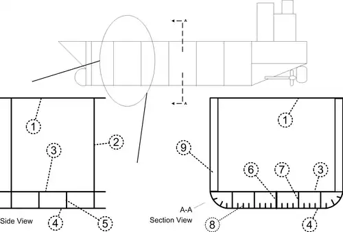 The depicted hull is a sample small double bottom (but not double hull) oil tanker.