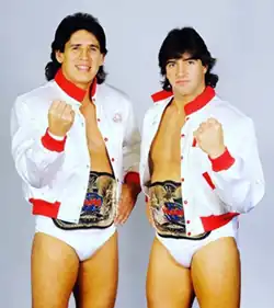 The team officially formed on a permanent basis after Martel defeated both members of The Islanders (Haku and Tama) in separate singles matches in July 1987[7] (after the departure of his then tag team partner Tom Zenk from the WWF, with Zenk's departure worked into the feud and used as fodder by the Islanders to taunt Martel). On the August 15, 1987 episode of WWF Superstars of Wrestling, the Islanders jumped Martel after his win over Barry Horowitz. Santana, who was doing commentary in the Spanish broadcast booth, ran to the ring to help Martel fight off the attackers.[5] The team were played off as good looking pretty boys (a story-line that came directly from the team's predecessor The Can-Am Connection) even using the theme called "Girls In Cars", which was originally made for the Can-Am Connection. The name Strike Force came from Santana's promise that as a team they would, "be striking (the Islanders) with force." Martel immediately came up with the team's name based on this.[8] They feuded with the Islanders until October, when they got a shot at The Hart Foundation for the Tag Team Championship. On October 27, 1987[9] they won the title when Jim Neidhart submitted to Martel's Boston crab.[10][11] While feuding with the Harts, they resumed their feud with the Islanders, successfully defending the title against both teams at house shows across the country.