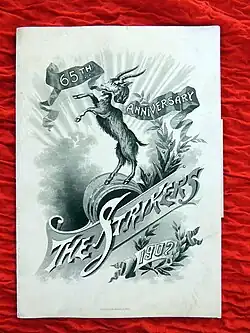 The Strikers Independent Society was formed initially by young men in Mobile who had been refused membership to the older Cowbellion de Rakin Society (which had been formed in year 1830 by "more sedate and astute men of the city").[2] In the beginning, it was designated as a bachelor-only society, and if a member married, then they were out of the society.[2] The Strikers, like the Cowbellions, paraded only on New Year's Eve and held their ball on New Year's Day.[2]