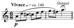 The movement again begins with the "Mesto" theme, this time in a slightly thinner texture than in the previous movement with three of the members of the quartet. This version of the slow introduction also features canonic elements, like in m. 7. The viola enters in m. 10, providing a harmony of stacked thirds.[11] It seems that Bartók uses similar devices in this movement as the previous. After the slow introduction, Bartók pairs different instruments off again, as seen in m. 26. The movement also features different pizzicato effects as well as quarter-tone slides in mm. 26-29, giving the movement a humorous slant.[12]